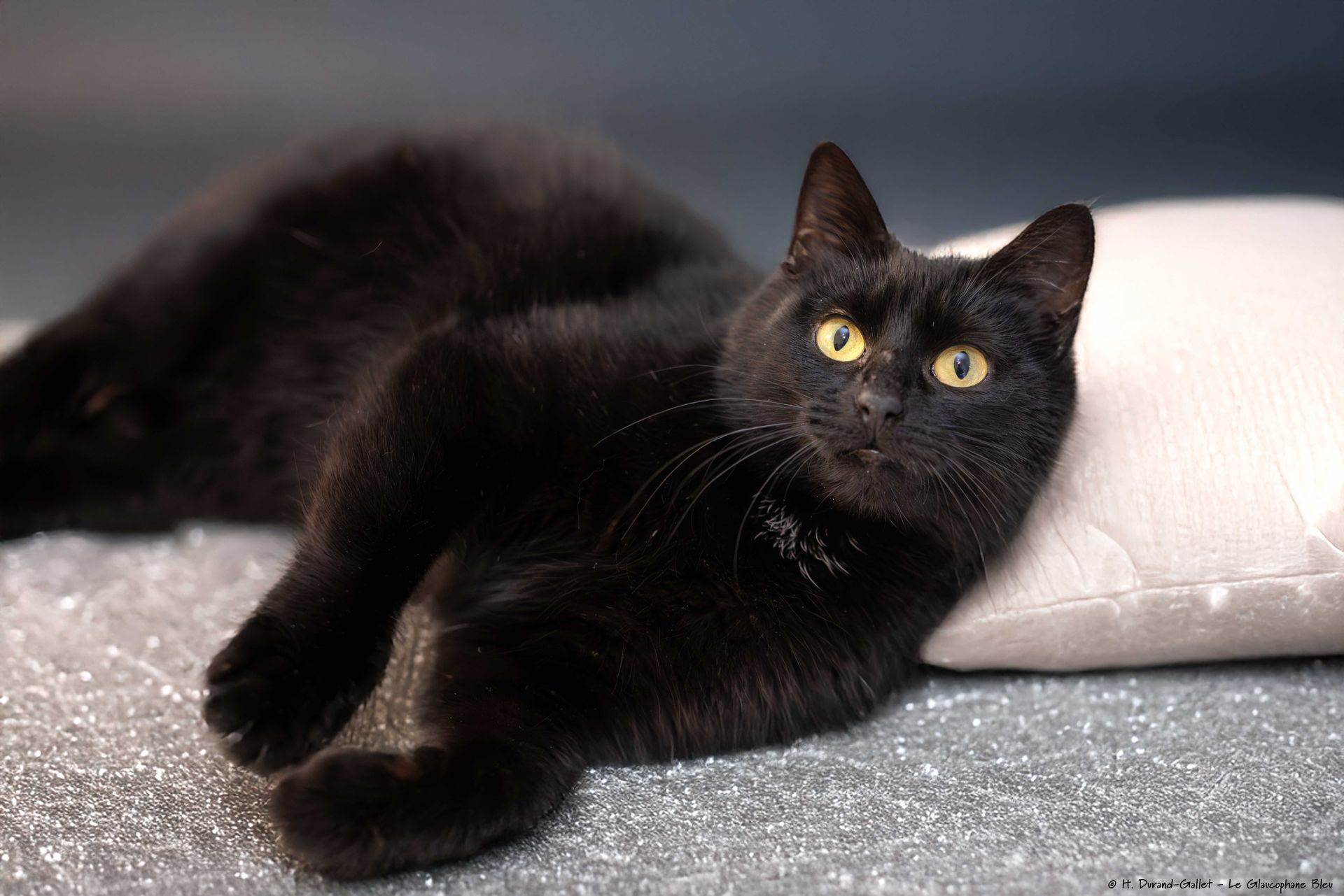 BALOO est un jeune chat à la fourrure noire et soyeuse, et aux yeux couleur de miel.